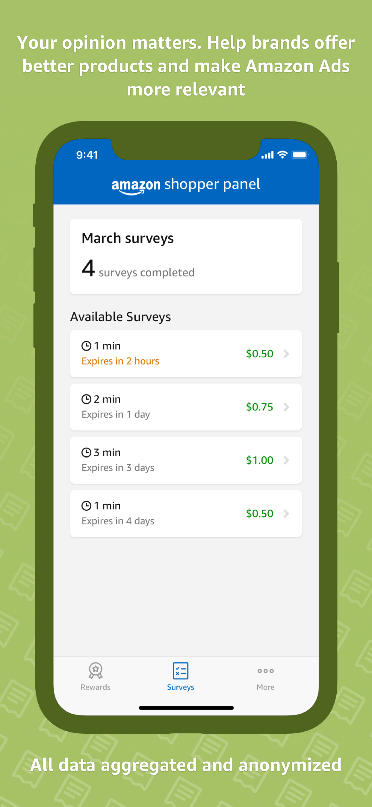 The Amazon Shopper Panel is an opt-in, invitation-only program where participants can earn monthly rewards by completing short surveys about your opinion on brands or products that may be of interest to you.